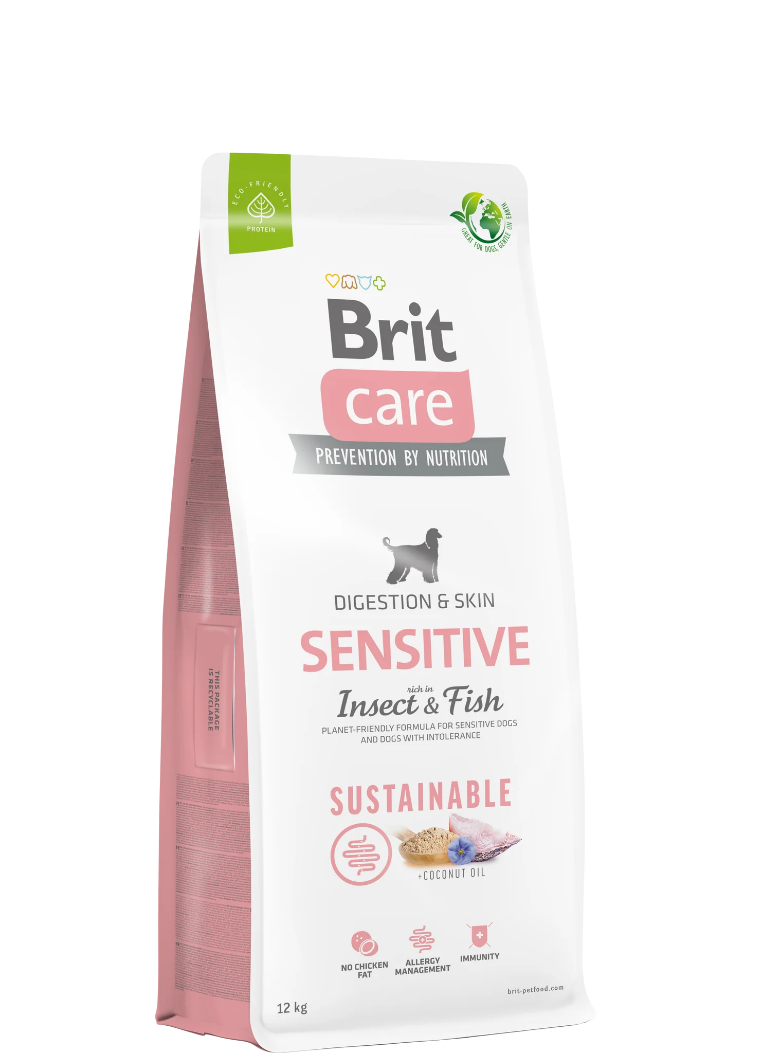 .Brit Care Dog Sustainable Sensitive. Fenntartható alapanyagokból készült, rovarokban és halhúsban gazdag gabonamentes recept intoleranciában szenvedő érzékeny kutyák számára. Teljes értékű kutyatáp.